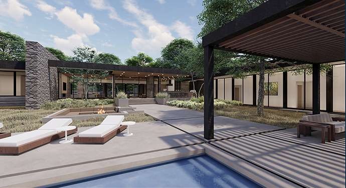 The Great Room opens to the landscape, supporting both large gatherings and private livability. Exterior materials were chosen for their ability to weather well in Napa’s climate, developing character without high maintenance. Outdoor spaces include a sunken fire pit positioned for the evening light, along with a pool, bocce ball court, tennis court, and shaded areas for dining and conversation.