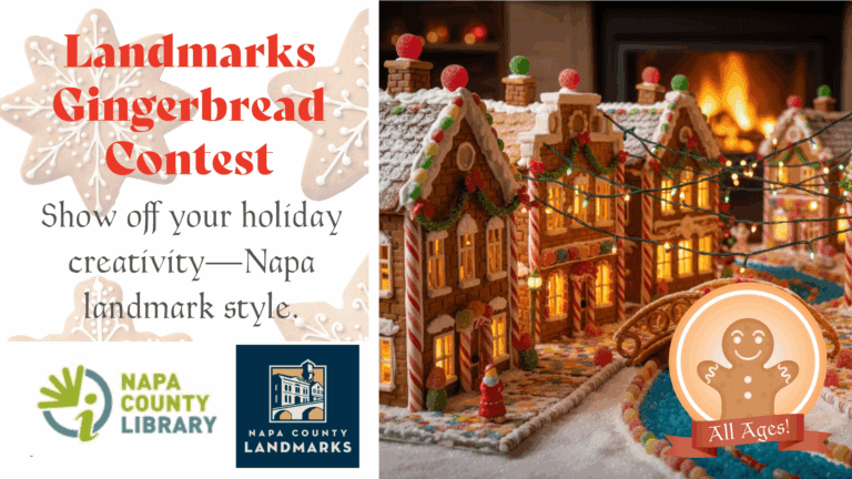 Ring in the local holiday spirit with Napa County Landmarks’ Landmarks Gingerbread Contest in partnership with the Napa County Library. Enter individually or as a group, have fun with the design, and join us in celebrating the architecture, culture, and creativity that make Napa unique. Entering is free!