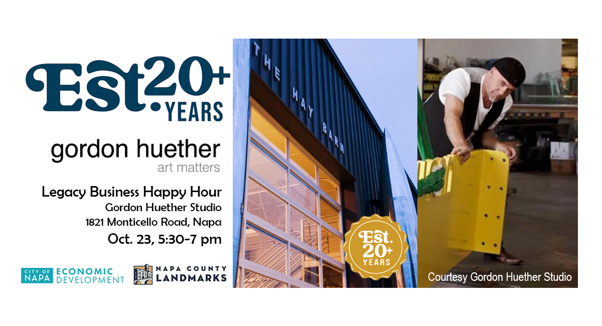 Join us for our inaugural Legacy Business Happy Hour at Gordon Huether Studio on Thursday, October 23, from 5:30–7:00 PM, hosted by the City of Napa Economic Development Division and Napa County Landmarks. Celebrate Napa’s Legacy Businesses in a setting that embodies local creativity and community spirit. Enjoy art, conversation, and connection with the people and places that help define Napa’s unique character.